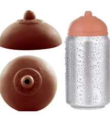 Tampa para lata de cerveja ou refrigerante, no formato de seio, com orifício para a saída do líquido. Uma gostosa brincadeira.